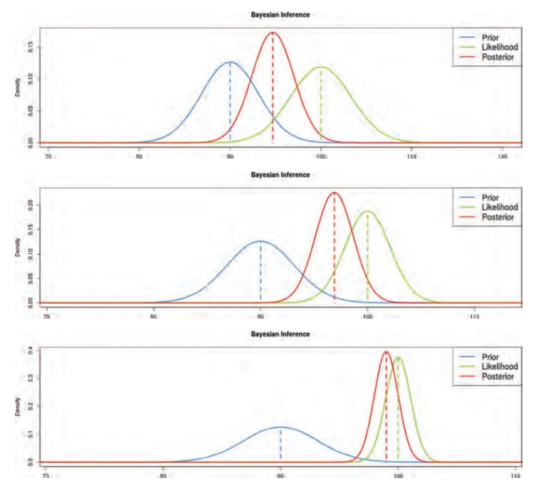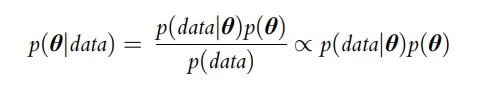 حيث تشير المعادلة اعلاه إلى مجموعة من المعلمات (على سبيل المثال ، معاملات الانحدار) ، p(θ|data) هي التوزيع اللاحق للمعلمات ، والتي تم الحصول عليها عن طريق تحديث التوزيع السابق للمعلمات p (θ) ، مع تمثيل البيانات المشاهدة بواسطة دالة الاحتمال ،p(data|θ) . المصطلح p(data) هو الاحتمال المشترك للبيانات التي يمكن اعتبارها ثابت طبيعي وتضمن أن تكامل التوزيع اللاحق يساوي (1) . كما يوضح الجانب الأيمن من المعادلة اعلاه ، فإن استبعاد هذا الحد ينتج عنه نتيجة متناسبة للتوزيع اللاحق.