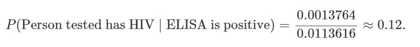 الأرقام المذكورة أعلاه هي تقديرات. ومع ذلك ، من أجل التحليل الاحصائي ، سوف نتعامل معها كما لو كانت حقيقية. هدفنا هو حساب احتمال الإصابة بفيروس نقص المناعة البشرية إذا كانت نتيجة اختبار ELISA إيجابية اي