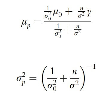 حيث تشير μ0 إلى متوسط التوزيع السابق الطبيعي ، وتشير y إلى المتوسط المشاهدة في العينة ، و n هو حجم العينة ، و σ20 هو التباين اللاحق في السابق ، و σ2 هو التباين في العينة المشاهدة . كل من التوزيعات السابقة واللاحقة هي توزيعات طبيعية ؛ هذه هي الحالة لأن التوزيع المسبق الطبيعي هو مترافق سابق للمعامل المتوسط. جميع التوزيعات السابقة المقترنة ، عند ضربها في دالة الاحتمال ، تؤدي إلى توزيعات لاحقة من نفس عائلة التوزيع الاحتمالي .