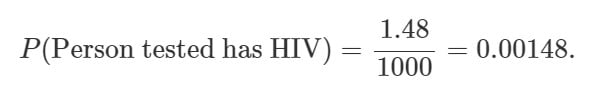 يرتبط أيضًا سؤالنا بانتشار فيروس نقص المناعة البشرية في إجمالي السكان على سبيل المثال لو اخذنا بلد مثل امريكا ، يقدر بـ 1.48 من بين كل 1000 بالغ . لذلك نحن نفترض