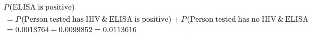 ان اختبار فيروس نقص المناعة البشرية الذي يعد مقياس تشخيص المناعي المرتبط بالإنزيم ، والمعروف باسم ELISA. في حال نرغب بدراسة احتمالية إصابة شخص ما بفيروس نقص المناعة البشرية إذا كانت نتيجة اختبار ELISA إيجابية. لهذا ، نحن بحاجة إلى المعلومات التالية. يتم تقدير المعدل الإيجابي الحقيقي لـ ELISA (واحد مطروحًا منه المعدل السلبي الخاطئ) ، والذي يشار إليه أيضًا بالحساسية أو الاسترجاع أو احتمال الكشف، ويقدر من خلال الاحتمال: