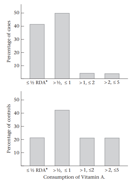 قبل إجراء أي محاولة للإجابة على هذا السؤال ، يجب وصف استهلاك فيتامين A بين مجموعتي الدراسة (الحالات والمراقبة ). الشكل ادناه تشير الرسوم البيانية الشريطية أن عناصر المسيطر عليها تستهلك فيتامين A أكثر مما تستهلكه الحالات ، خاصة عند مستويات الاستهلاك التي تتجاوز البدل اليومي الموصى به ( Recommended Daily Allowance(RDA) ).