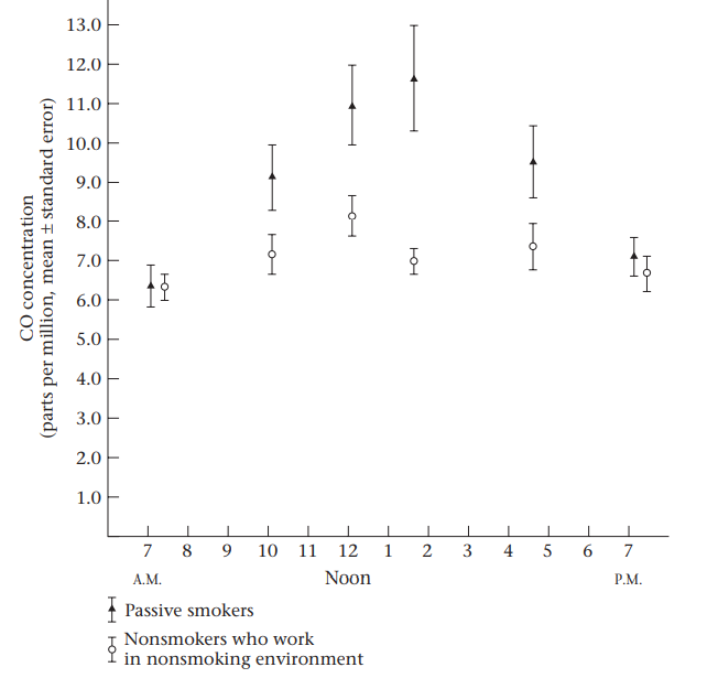 المثال الثاني : أمراض الرئة: اشتبه الاطباء الباحثين في كثير من الأحيان في أن المدخنين السلبيين – الأشخاص الذين لا يدخنون بأنفسهم ولكنهم يعيشون أو يعملون في بيئة يدخن فيها الآخرون – قد يعانون من ضعف في وظائف الرئة نتيجة لذلك. في عام 1980 نشرت مجموعة بحثية في سان دييغو نتائج تشير إلى أن المدخنين السلبيين لديهم بالفعل وظيفة رئوية أقل بكثير من غير المدخنين الذين لم يعملوا في بيئات مدخنة . كدليل داعم ، قام الباحثون بقياس تركيزات أول أكسيد الكربون (CO) في بيئات العمل للمدخنين السلبيين وغير المدخنين الذين لم تسمح شركاتهم بالتدخين في مكان العمل لمعرفة ما إذا كان تركيز ثاني أكسيد الكربون النسبي قد تغير على مدار اليوم. يتم عرض هذه النتائج كمخطط مبعثر في الشكل ادناه .