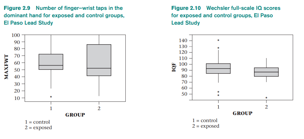 نلاحظ أنه على الرغم من وجود انتشار كبير داخل كل مجموعة ، فإن كل من درجات النقر بالإصبع والرسغ (MAXFWT) ودرجات معدل الذكاء على نطاق كامل (IQF) تبدو أقل قليلاً في المجموعة المعرضة منها في المجموعة الضابطة. نقوم بتحليل هذه البيانات بمزيد من التفصيل باستخدام اختبارات t ، وتحليل التباين ، وطرق الانحدار.