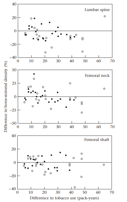 لاحظ أنه بالنسبة للعمود الفقري القطني تظهر علاقة عكسية بين الاختلاف في كثافة المعادن بالعظام والفرق في استخدام التبغ (اتجاه تنازلي). تقريبًا جميع الاختلافات في كثافة المعادن بالعظام تقل عن الصفر ، خاصة بالنسبة للتوائم الذين لديهم اختلاف كبير في استخدام التبغ (30 سنة ) ، مما يشير إلى أن التوأم الذي يدخن كثيرًا كان لديه كثافة عظام معدنية أقل من التوأم الأخف تدخينًا. توجد علاقة مماثلة مع كثافة المعادن بالعظام في عنق الفخذ. النتائج أقل وضوحا لجسم الفخذ. هذا مثال كلاسيكي لدراسة الأزواج المتطابقة ، بالنسبة لمثل هذه الدراسة ، يتم مطابقة مجموعتين هما :المعرضين (التوأم الأكثر تدخينًا) والمسيطرة (التوأم الأخف تدخينًا) مع الخصائص الأخرى المتعلقة النتيجة (كثافة المعادن بالعظام). في هذه الحالة ، تعتمد المطابقة على وجود جينات متشابهة. نقوم بتحليل مجموعة البيانات باستخدام طرق تعتمد على التوزيع ذي الحدين ، واختبارات t ، وتحليل الانحدار.