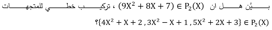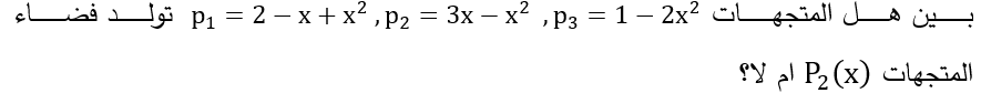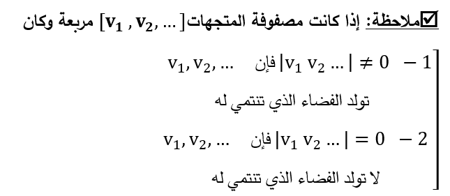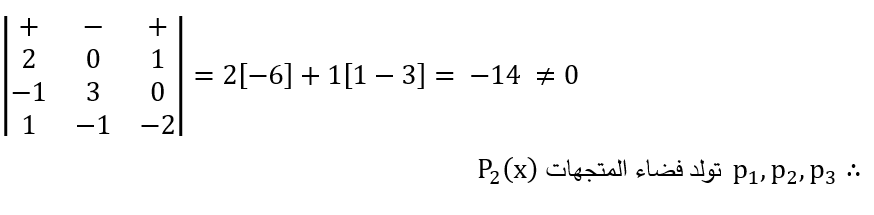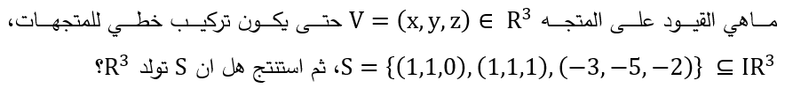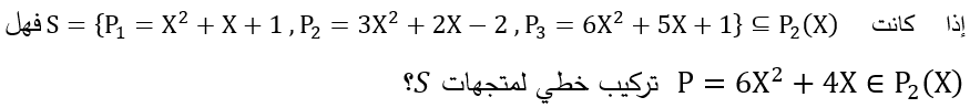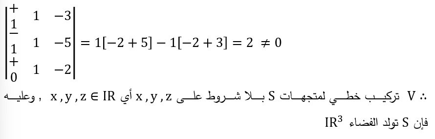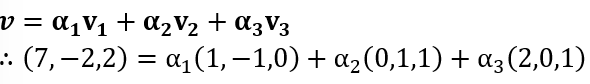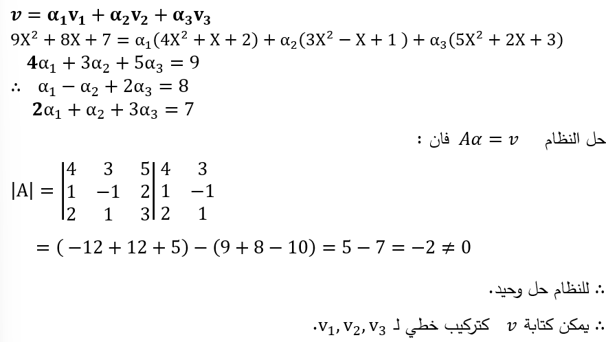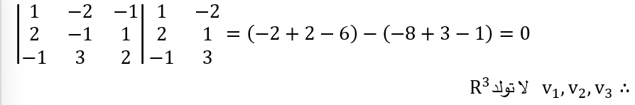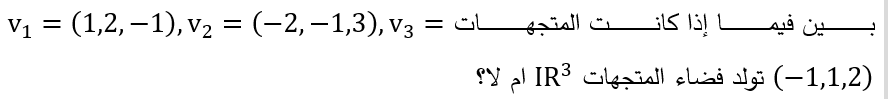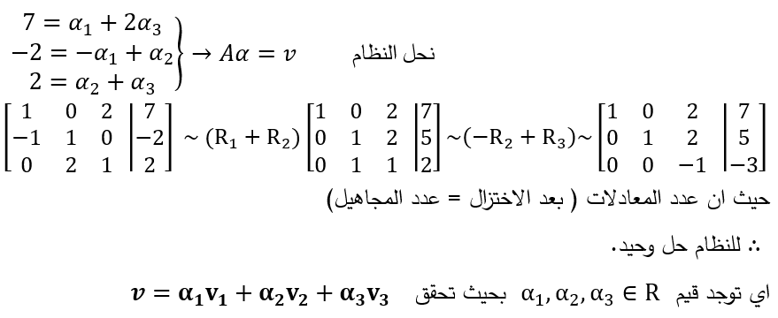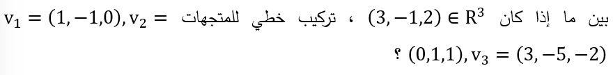 مثال (1) : إذا كانت {v1=(1,-1,0) ,v2=(0,1,1),v3=(2,0,1)} تنتمي الى R3 وكان v=(7,-2,2)∈R3 ، فبين هل v تركيب خطي للمتجهات v1,v2,v3 ؟
