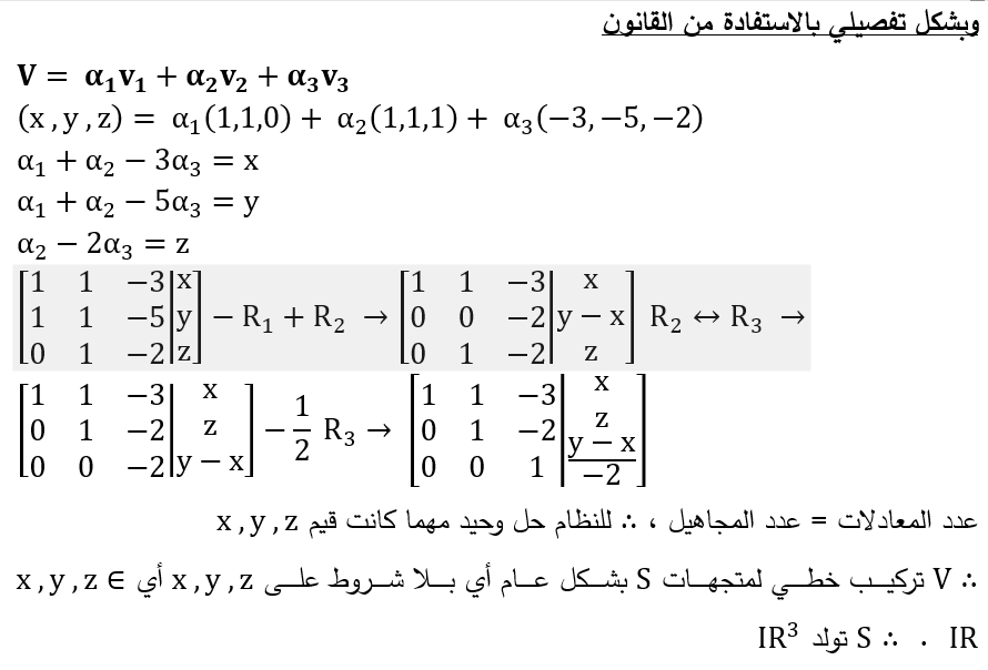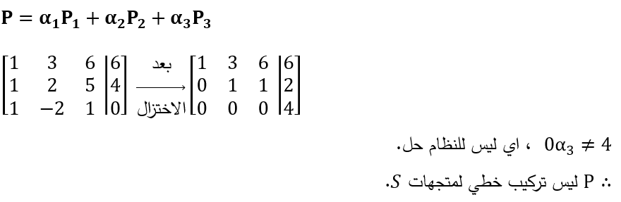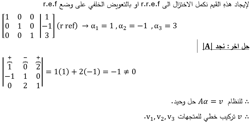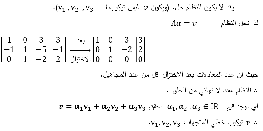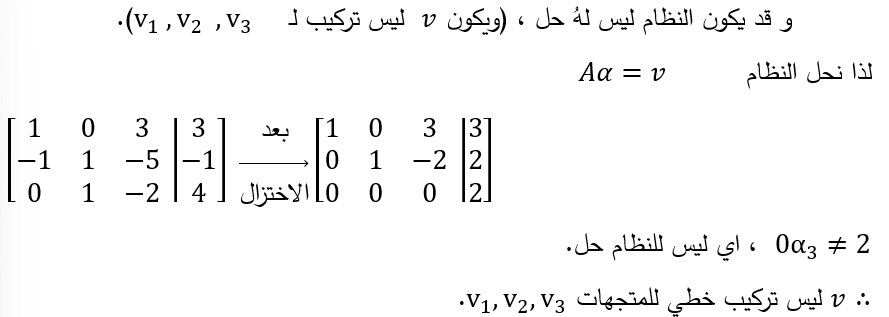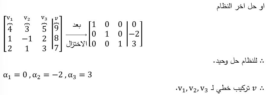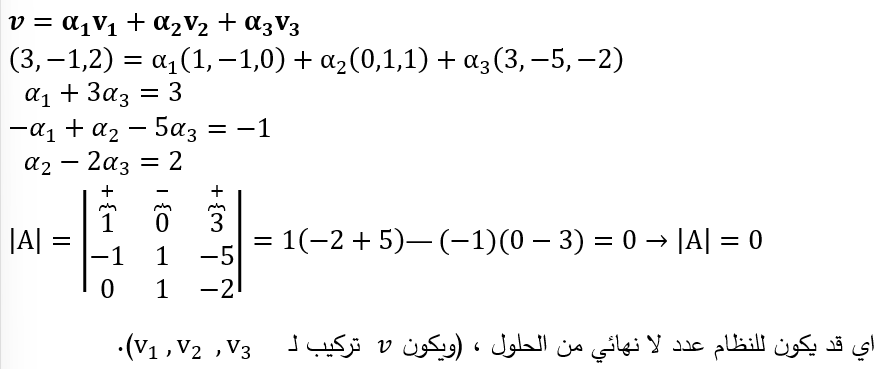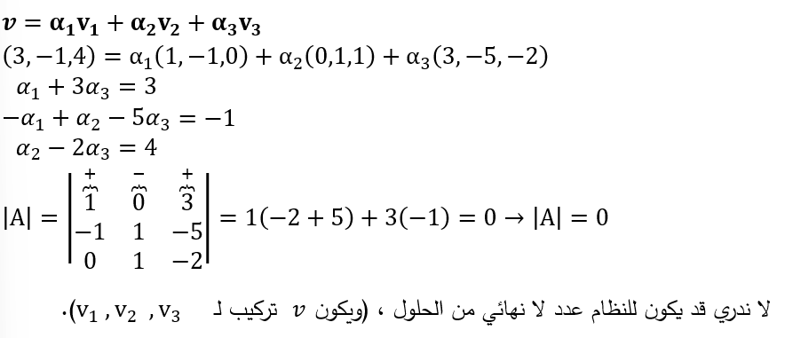 مثال (3) : بين ما إذا كان يمكن كتابة المتجه v=(3,-1,4) ، كتركيب خطي للمتجهات. v1=(1,-1,0),v2=(0,1,1),v3=(3,-5,-2) ؟
