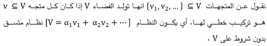 ليكن V فضاء متجهات اذ ان v1,v2,…∈V وليكن v∈V، نقول ان v تركيب خطي لـ v1,v2,… اذا وجدت اعداد حقيقية مثل …,α12 تنتمي الى IR بحيث ان … , v=α1 v1, α2 v2