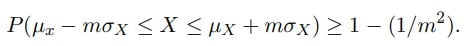 قاعدة Chebyshev : في الواقع ، هناك قاعدة تسمى Chebyshev للمتغيرات العشوائية تنص : إذا كانت m> 1 ، فإن احتمال أن يقع X ضمن الانحرافات المعيارية لمتوسطه يكون على الأقل 1 − (1/m2);اي ان ،