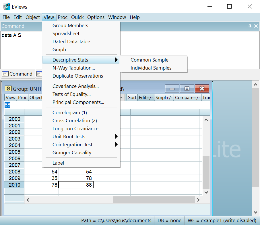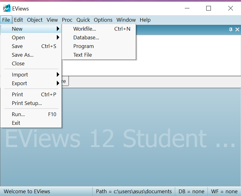 مجرد فتح Workfile، يمكنك كتابة البيانات في EViews. سيعطيك استخدام عناصر القائمة