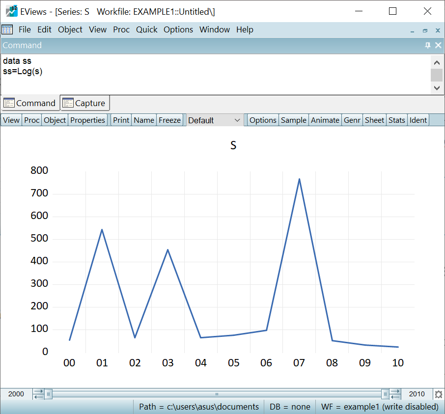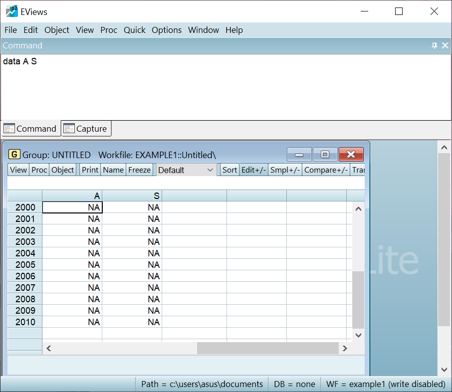 لإدخال البيانات التي قمت بتحديد الفترة الزمنية لها ونوعها وهي مثلا غير مؤرشفة وتتكون من ١٠ قيم ، اكتب في الفراغ الذي تحت شريط القوائم ( نافذة البرامج ) أمر Data وحدد المتغيرات المطلوب إدخالها ولتكن A , S بحيث يكون بين كل متغير وأخر مسافة، كما في الشكل
