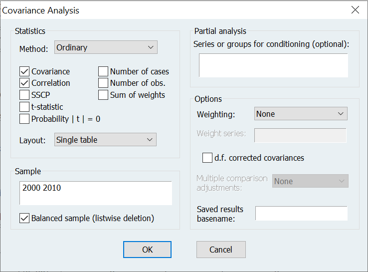 من صفحة البيانات ومن قائمة View نختار ◄ Covariance Analysis، وكما مبين في الرسم التوضيحي، ويوجد العديد من الاختيارات التي تساهم في ايجاد نتائج احصائية للبيانات المدروسة