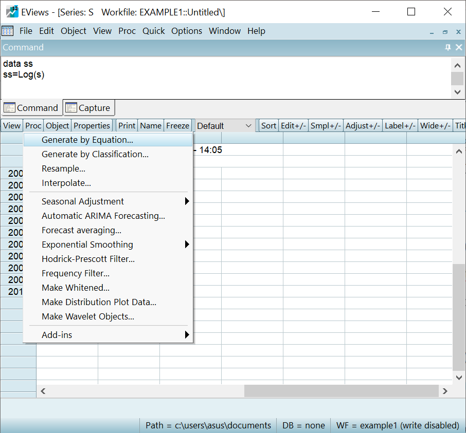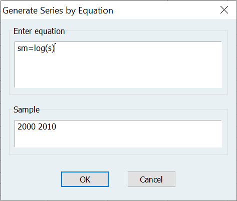 غالبًا ما يكون من الضروري تحويل البيانات أو تغييرها قبل حساب الإحصاء الوصفي أو الرسم . تم الآن وصف عدد من إجراءات التصفية المهمة ، ومن الممكن كتابة المعادلة التالية في قسم procبقائمة Workfile ومن ثم نضغط على Generate by Equation ويمكن اضافة اسم المتغير الجديد وبجانبه معادلة التحويل المراد ايجادها البرنامج سيكّون اسم المتغير الجديد بعد اجراء التحويل على متغير موجود اصلا في قائمة البيانات: