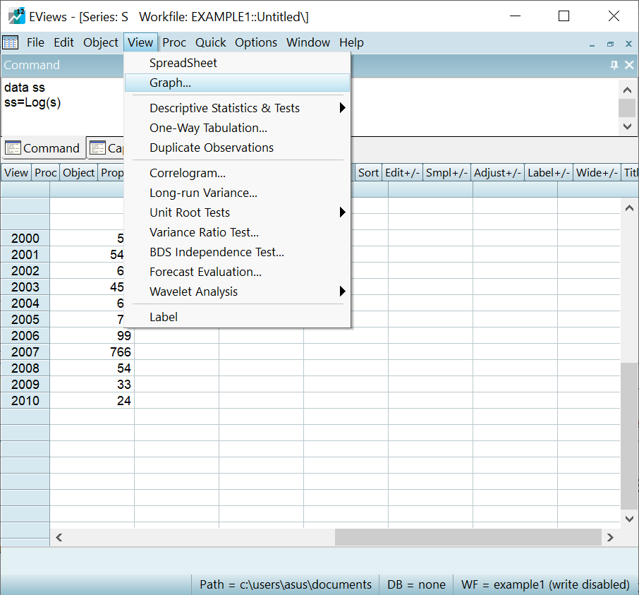 من أجل رسم السلسلة على نفس الرسم البياني ، انقر فوق القائمة “عرض View ” ثم “الرسم البياني Graph في القوائم المنسدلة . وتوجد عدة انواع للرسوم حسب طبيعة البيانات الزمنية او مقاطع عرضية او Panel ، ويتم من خلال الايعاز نفسه رسم التوزيع الاحتمالي للسلسة الزمنية او رسم الصندوق Poxplot للكشف عن القيم المتطرفة او رسم الربيعيات وغيرها من الانواع.