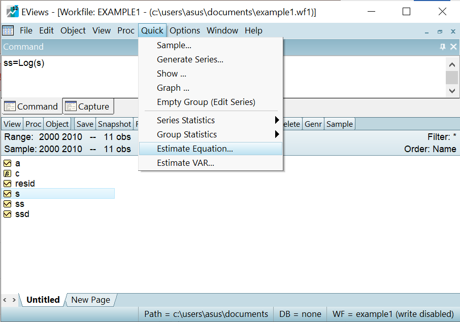 لتقدير معادلة الانحدار البسيط بوجود متغير توضيحي (Explanatory Variable) ومتغير معتمد (Dependent Variable) نضغط على زر Quick في صفحة Workfile ونختار الامر Equation Estimation كما في الشكل.