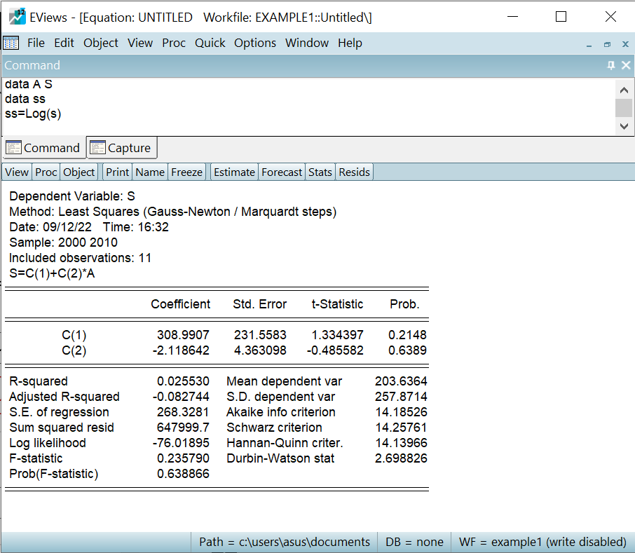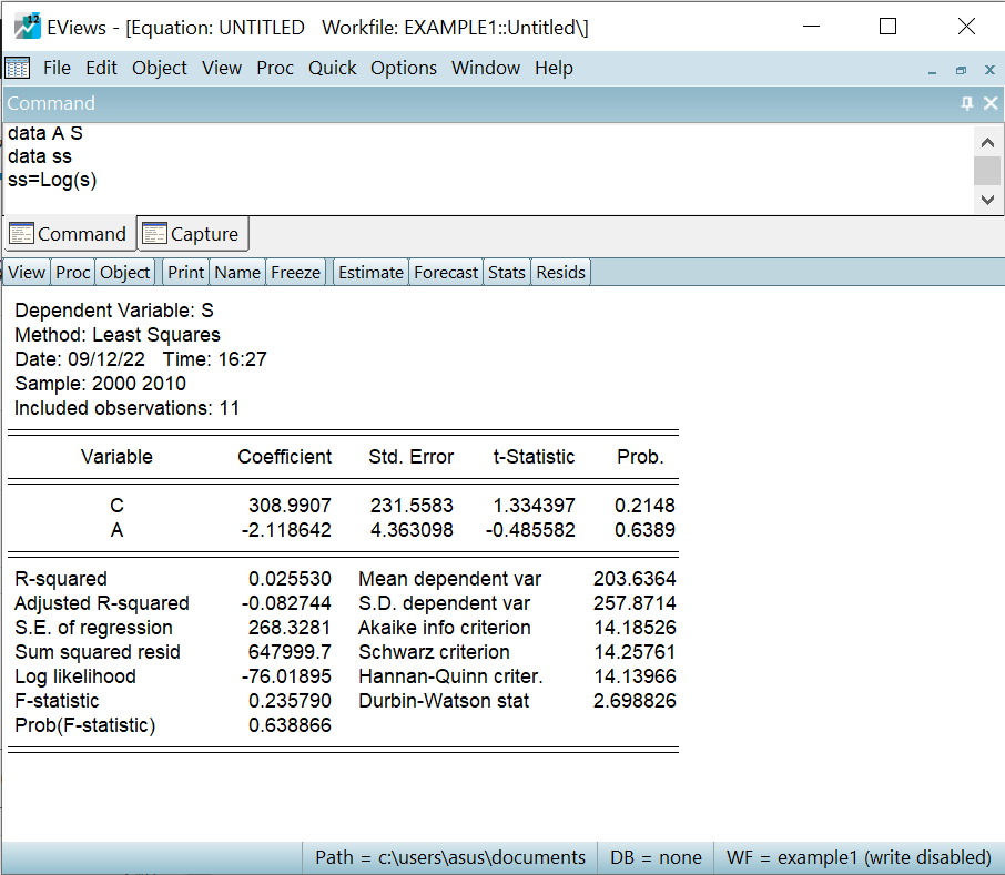 يقصد بالحرف الاول (S) المتغير المعتمد كما هو موجود في Workfile ونكتب c الذي يرمز لمعلمة الحد الثابت وبعدها نكتب رمز المتغير التوضيحي (ِِA) والمخزون ايضا ضمن Workfile وكما مبين بالشكل