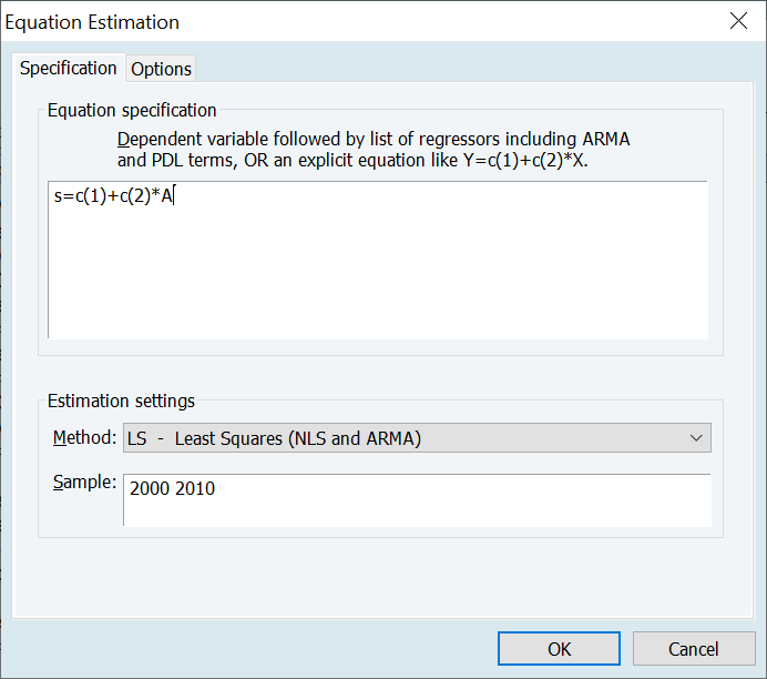 في مربع Equation Estimation يتم كتابة صيغة الانحدار البسيط بالشكل ويوجد طريقتان لكتابة المعادلة اما وفق الشكل المباشر كما في ادناه