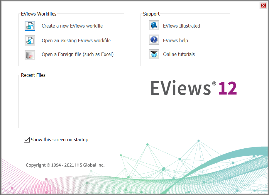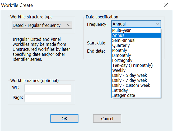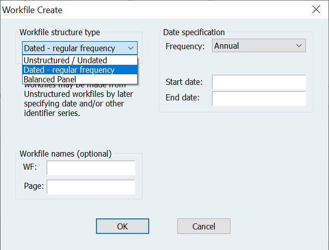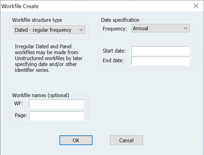 يتم الضغط على create a new EViews workfile للبد بفتح ملف عمل جديد عندها يتم تحديد الفترة الزمنية للبيانات ونوع البيانات المدخل او حدد File / New / Workfile في شريط القائمة الرئيسية لـ EViews. ستظهر نفس النافذة ادناه: