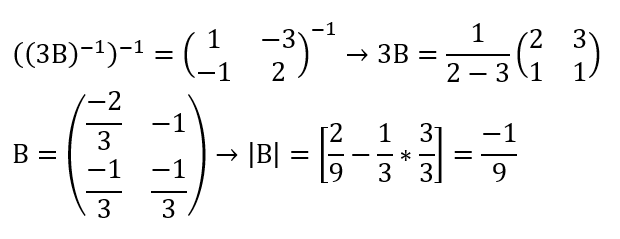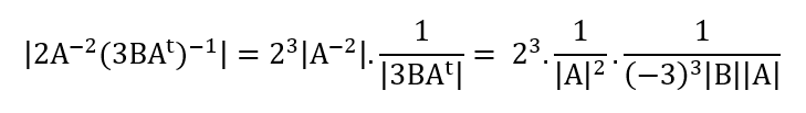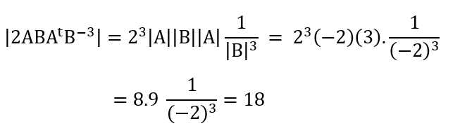 مثال (11): اذا كانت A و B مصفوفتان من الدرجة الثالثة وكانA|=3 , |B|=-2 | فإحسب |2ABAt B-3 |؟