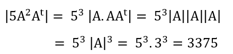 مثال (10) : اذا كانت A مصفوفة مربعة من الدرجة الثالثة وكان A|=3 |، فإحسب |5A2 At | ؟