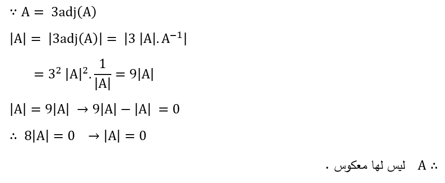 مثال (14) : اذا كانت A مصفوفة من الدرجة الثانية وكانت (A= 3adj(A)) فاثبت ان A ليس لها معكوس ؟