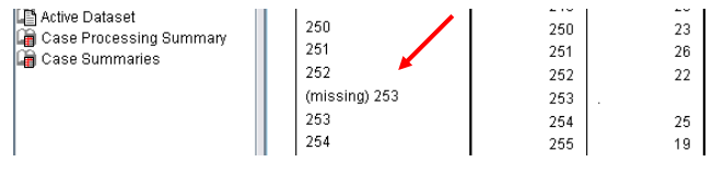 -قم بالتمرير لأسفل في جدول Case Summaries حتى تجد تعريف القيمة المفقودة وقم بتدوين رقم الحالة (الصف). رقم الصف هو 253 للقيمة المفقودة.