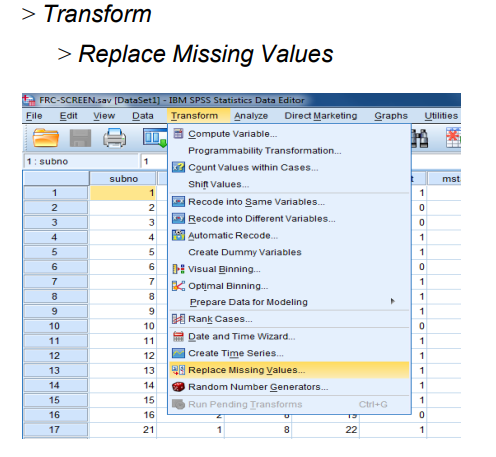 سيوضح المثال التالي كيفية اكتشاف قيمة مفقودة في متغير واستبدالها بمتوسط المتغير (قبل استبدال المتغير المفقود). لنفس ملف البيانات السابقة يتم تتبع التوجيهات الاتية