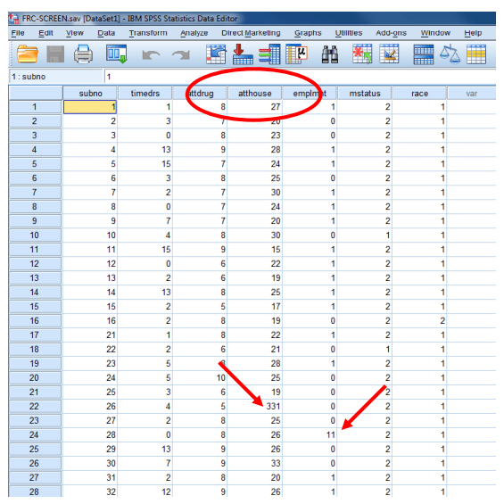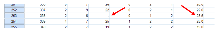 -قم بالتمرير لأسفل في جدول بيانات عرض البيانات Data View حتى تجد الصف 253 (“الرقم الفرعي” 338). لاحظ أن الخلية الموجودة ضمن “atthouse_1” هي 23.5 حيث تكون قيمة “atthouse” الأصلية مفقودة. يمكن استخدام هذا المتغير الجديد “atthouse_1” مع الاستبدال المتوسط للتحليلات اللاحقة بدلاً من “atthouse” الأصلي مع القيمة المفقودة.