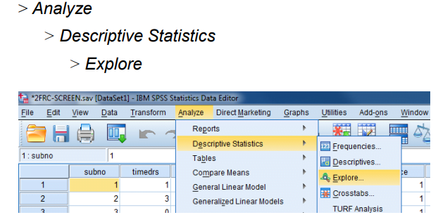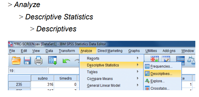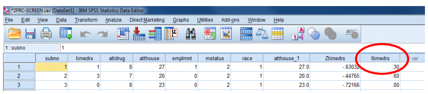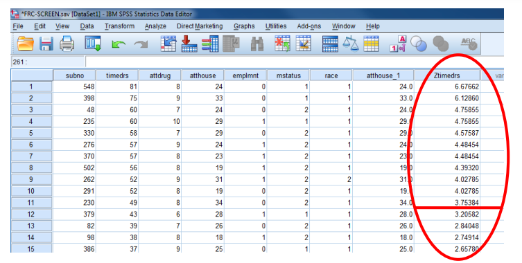 -انقر خارج نتائج “Descriptives” وشاهد المتغير الجديد في نهاية جدول بيانات عرض البيانات المسمى “Ztimedrs” .