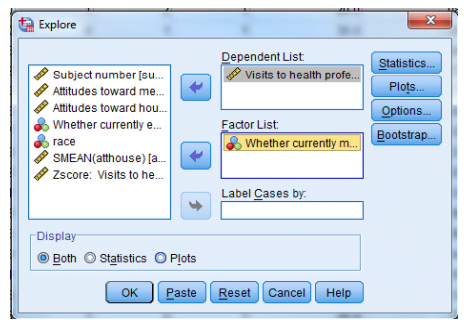 – انقر فوق المتغير المستقل (“ما إذا كان متزوجًا حاليًا [mstatus]”) لعامل قائمة (Factor List) :