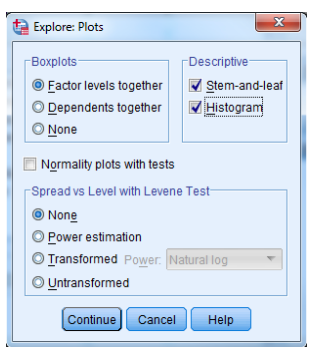 – ثم حدد المدرج التكراري والمخططات الطبيعية (Histogram and Normality plots) مع الاختبارات(tests)