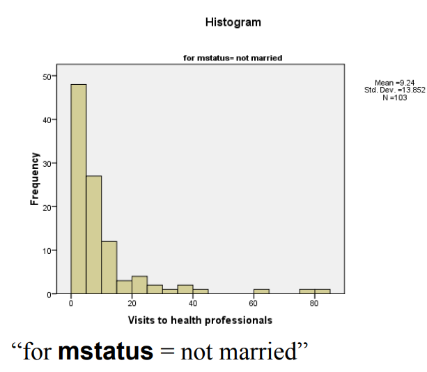 “بالنسبة إلى الحالة = غير متزوجة” (“for mstatus = not married) انحراف إيجابي طفيف ، يتم توزيعه بشكل طبيعي ، ولا توجد انقسامات كبيرة في التوزيع