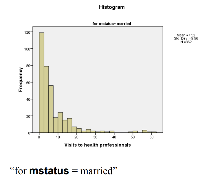 لتوضيح اختبار الافتراضات أحادية المتغير ، لنبدأ بتحليل المتغير التابع dependent variable (“زيارات المهنيين الصحيين [timedrs]”) من سؤالنا البحثي الأصلي ، من أجل التوزيع الطبيعي. اكتشفنا في الفرز الشاذ أن هذا المتغير يحتوي على أحد عشر قيمة شاذة أحادية المتغير. لقد أجلنا اتخاذ قرار بشأن ما يجب فعله مع القيم المتطرفة أحادية المتغير إلى ما بعد الاختبار للتوزيع الطبيعية وتجانس التباين. قمنا بإجراء تحليل البيانات التالي: