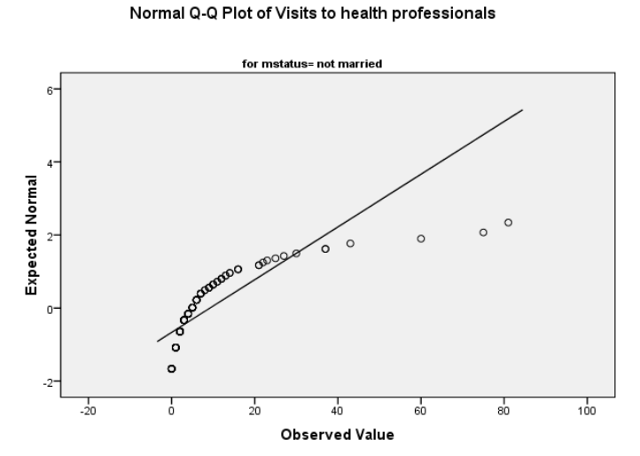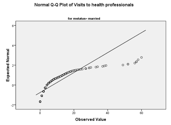 من المحتمل أن يكون أفضل خيار لنا هو تحويل المتغير ، ولكن نظرًا لأن القيم المتطرفة ربما تؤثر على التوزيع الطبيعي لمتغير مثل “زيارات المهنيين الصحيين (بالوقت)” ، سوف نحاول تقييم الافتراضات أحادية المتغير قبل أن نتخذ القرار النهائي بالحذف.