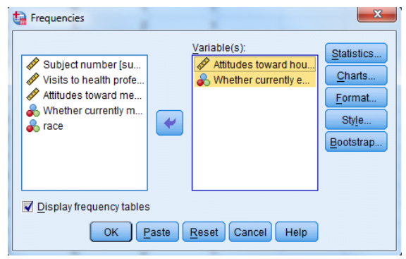 – انقر فوق “المواقف تجاه الأدوية (الأدوية)” و “المواقف تجاه الأعمال المنزلية (المنزل)” و “ما إذا كان متزوجًا حاليًا (mstatus)” ضمن قائمة المتغير (المتغيرات):