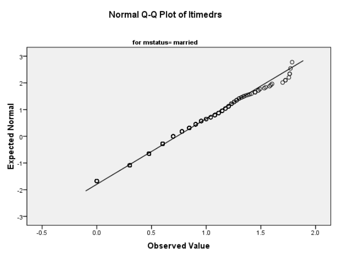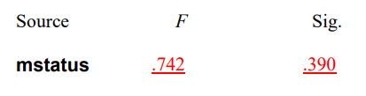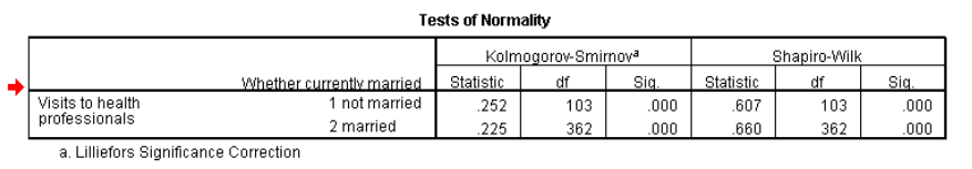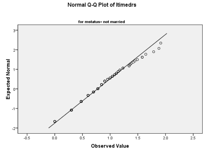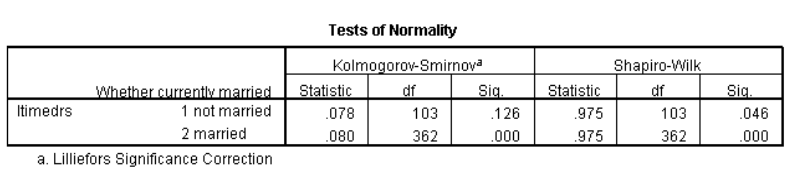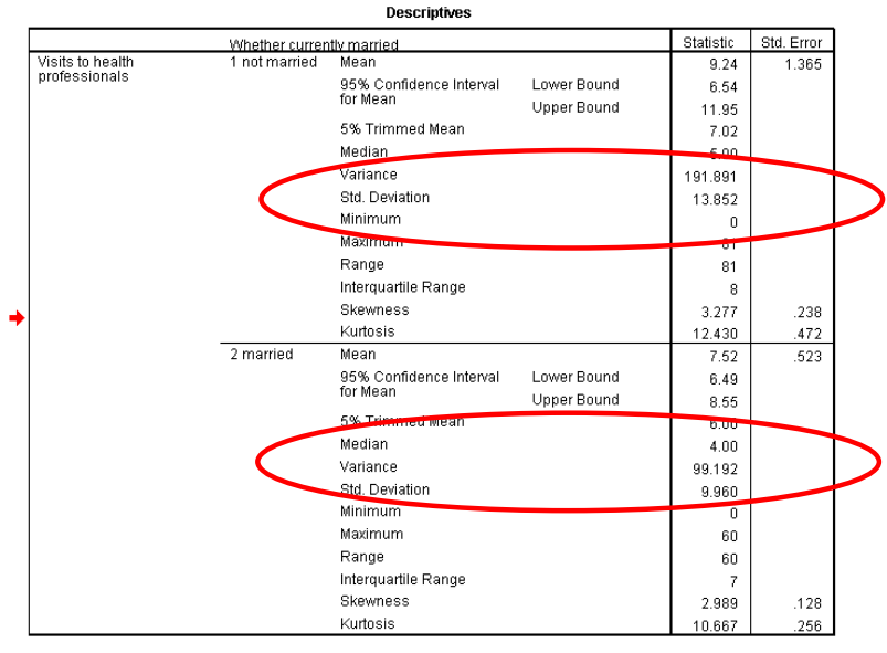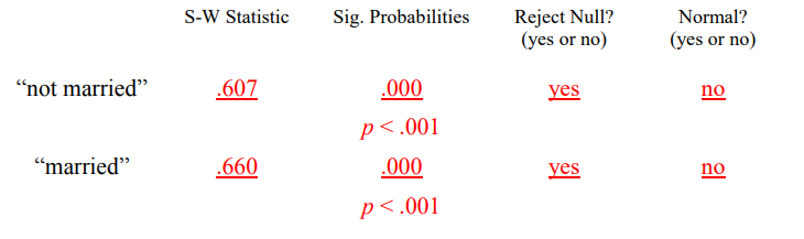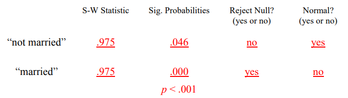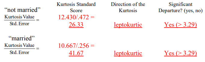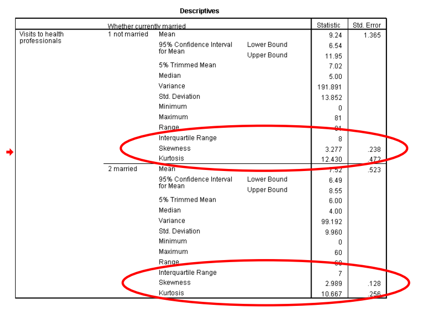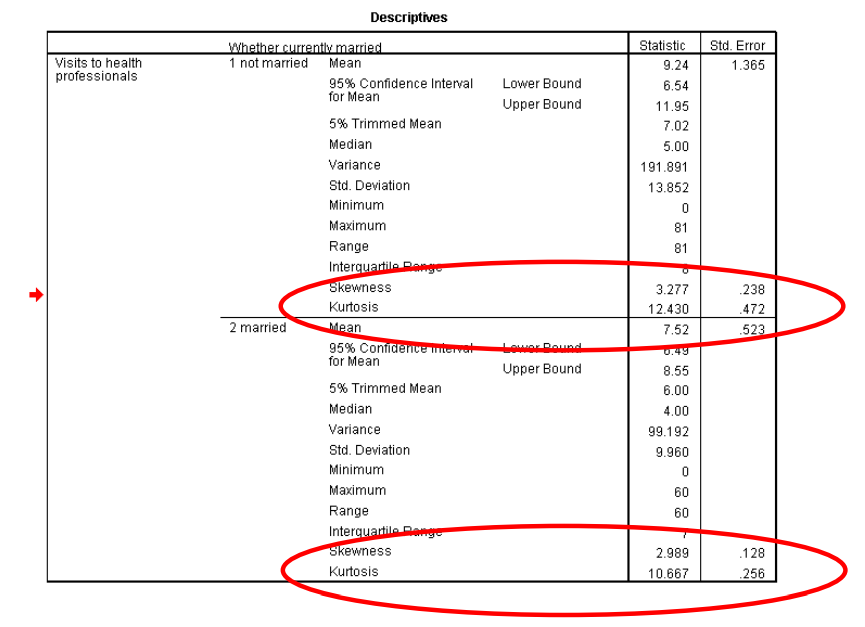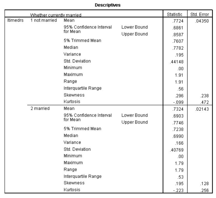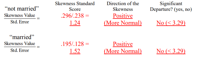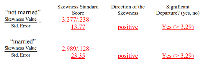 مرر لأعلى وصولاً إلى الجزء العلوي من النتائج إلى “الوصف الاحصائي “Descriptives”. سترى قيم الالتواء وقيم الخطأ المعياري لكل من “mstatus = not married” و “mstatus = married”. فسر التواء التوزيعات مع توفير المعلومات المطلوبة أدناه.