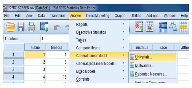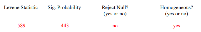 اختبار Levene هو اختبار تجانس التباين وهو أقل اعتمادًا على افتراض الحالة الطبيعية من معظم الاختبارات ، وبالتالي فهو مفيد بشكل خاص في تحليل التباين. يتم الحصول عليها عن طريق حساب الاختلافات المطلقة من وسط الخلية الخاص بها لكل حالة وإجراء تحليل أحادي الاتجاه للتباين على هذه الاختلافات. إذا كانت إحصائية اختبار ليفين معنوية ، فإن المجموعات ليست متجانسة وقد نحتاج إلى التفكير في تحويل البيانات الأصلية أو استخدام احصاءات غير معلمية (Norusis ، 1994a). للحصول على نتائج اختبار Levene ، سنحتاج إلى إجراء تحليل آخر. اتبع الإرشادات أدناه. أولاً ، انقر فوق النتائج الذي كنا نستخدمه. أوامر للحصول على إحصاء ليفين لتجانس التباين.