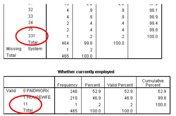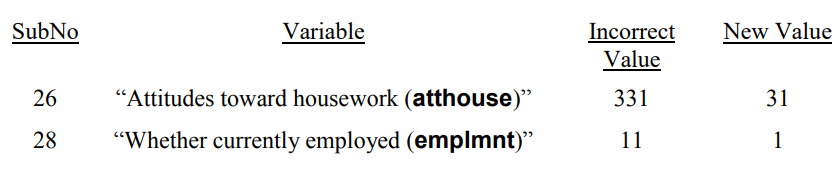 راجع جداول التكرارات لكل متغير. يجب أن يكون واضحًا أن القيمة 331 في جدول التكرار لـ “المواقف تجاه الأعمال المنزلية (atthouse)” وقيمة 11 في جدول التردد لـ “سواء كان مستخدمًا حاليًا (emplmnt)” لها دقة مشكوك فيها. تم إدخال كلا القيمتين بشكل غير صحيح