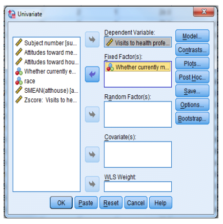 -. انقر فوق المتغير المستقل (independent variable) (“سواء كان متزوجًا حاليًا [mstatus]”) لعامل (عوامل) ثابتة: قائمة (Factor(s): list).