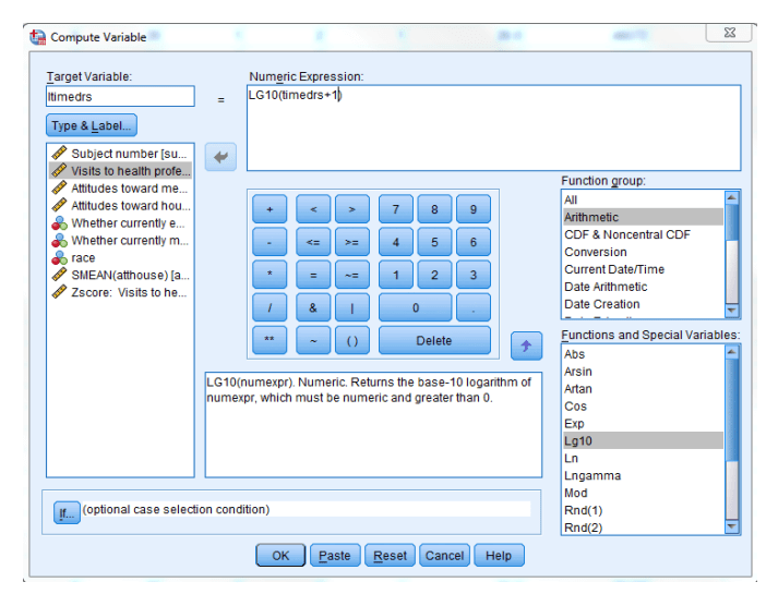 نظرًا لأن لدينا متغيرًا تابعًا ملتوي إيجابي بشكل كبير (“زيارات المهنيين الصحيين [timedrs]” ، فإننا سنستخدم تحويل log10. قم بتشغيل التحليل التالي بعد النقر فوق النتائج الذي كنا نستخدمه: