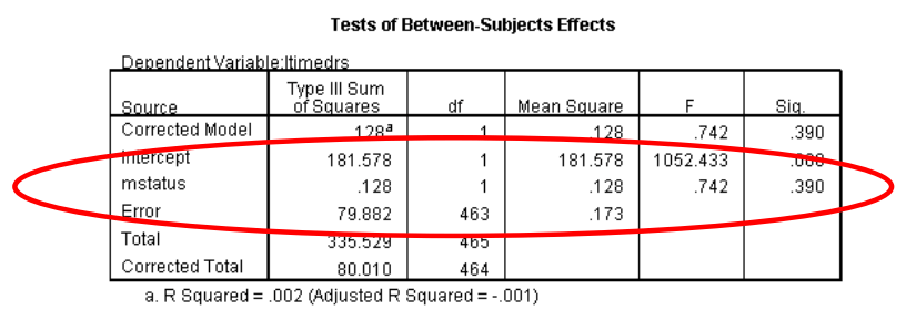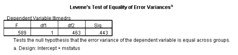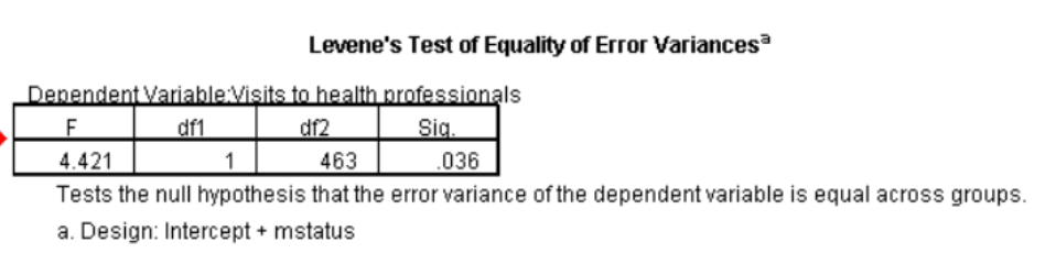 نظرًا لأن المتغير التابع يظهر الآن بشكل أكثر ملاءمة بعد التحويل ، يمكننا الآن الإجابة على سؤال الدراسة ، هل هناك فرق كبير بين النساء المتزوجات وغير المتزوجات في عدد الزيارات التي يقمن بها للمهنيين الصحيين من خلال اختبار الفرضية الصفرية (Null Hypothesis) التي تكون لا توجد فروق بين النساء المتزوجات وغير المتزوجات في عدد الزيارات التي يقمن بها للمهنيين الصحيين (H0: μ1 = μ2).