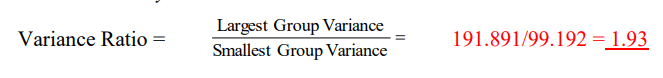 يمكن الحصول على تحليل نسبة التباين لمجموعتين من خلال قسمة أدنى تباين لمجموعة بالنسبة إلى أعلى تباين للمجموعة من الفروق بين المجموعتين. ينشأ القلق إذا كانت النسبة الناتجة 4-5 + مما يشير إلى أن التباين الأكبر هو 4 إلى 5 أضعاف أصغر تباين . يشير Tabachnick و Fidell (2007) إلى هذه النسبة باسم Fmax ويذكران “إذا كانت أحجام العينات متساوية نسبيًا (ضمن نسبة 4 إلى 1 أو أقل لحجم الخلية الأكبر إلى الأصغر) ، فإن Fmax كبير مثل 10 مقبول. مع زيادة التناقض في حجم الخلية (على سبيل المثال ، ينتقل إلى 9 إلى 1 بدلاً من 4 إلى 1) .