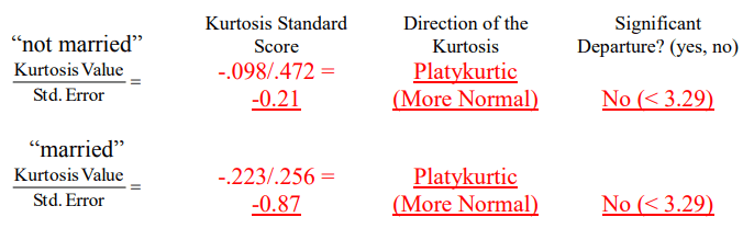 قسمة إحصاءة التفرطح kurtosis statistic على الخطأ المعياري standard error. نريد أن نعرف ما إذا كانت قيمة الدرجة القياسية هذه تنحرف بشكل كبير عن التوزيع الطبيعي. ينشأ القلق عندما تكون إحصائية التفرطح مقسومة على خطأها القياسي أكبر من z = +3.29 (p <.001 ، اختبار ثنائي الذيل (باتجاهين)) (Tabachnick & Fidell ، 2003 ، 2007)